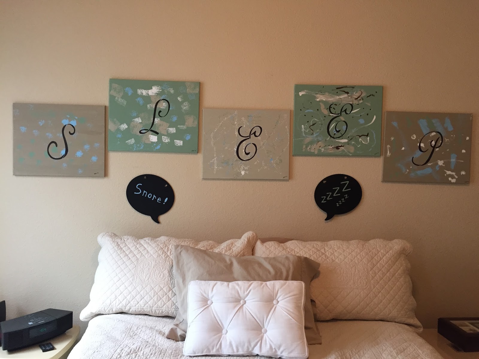 When he was done with his art work, I laid them all out to dry and then stenciled them with the letter stencils, and a very large black sharpie. I then painted the word snore on one talking bubble and ZZZs on the other bubble.
